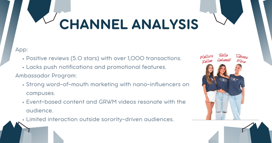 Recommendations included new splash screens tied to seasonal campaigns, expanded influencer partnerships beyond sororities, SEO revamp, and gamified referral rewards to boost network effects and community-driven content.
